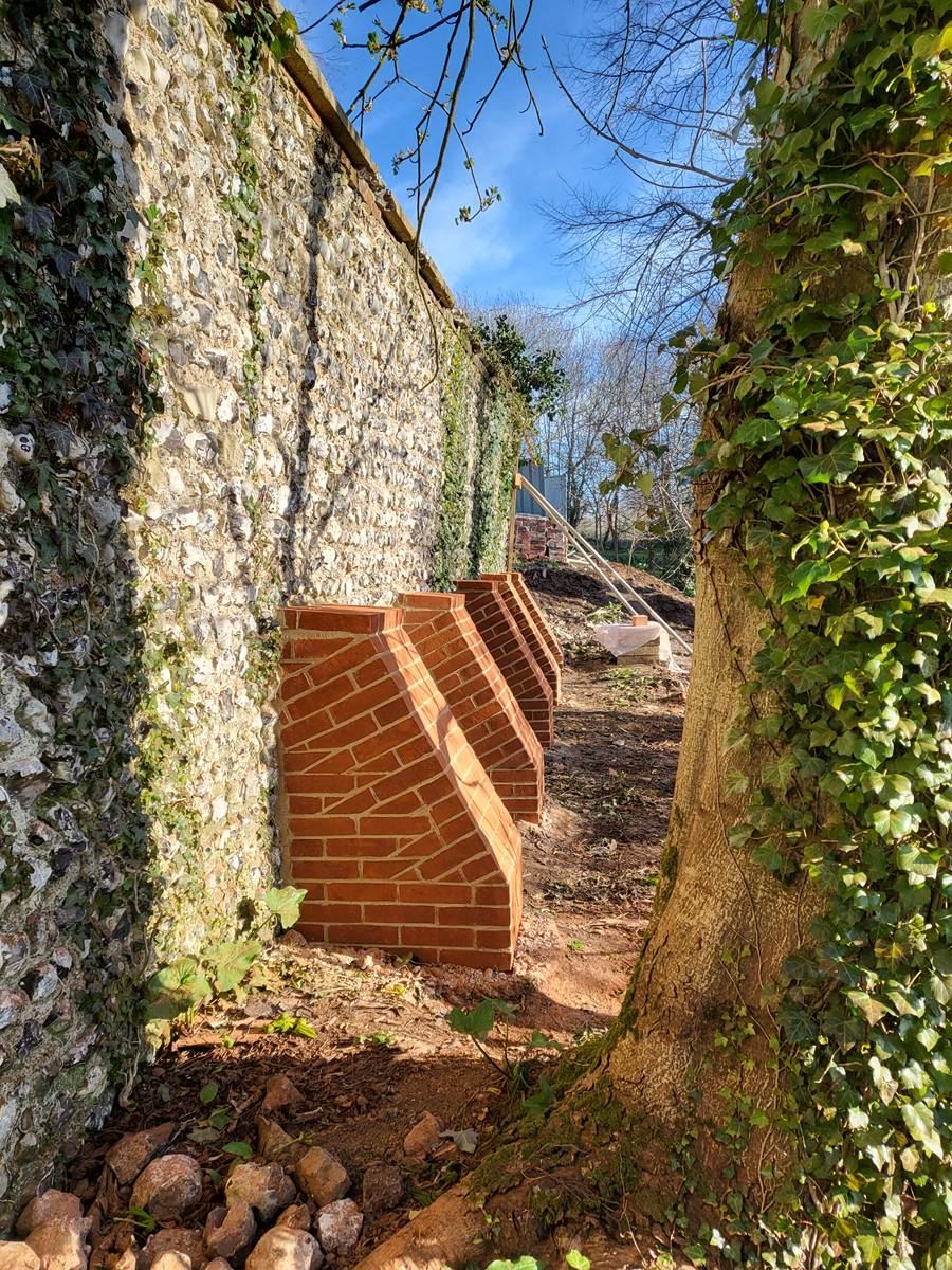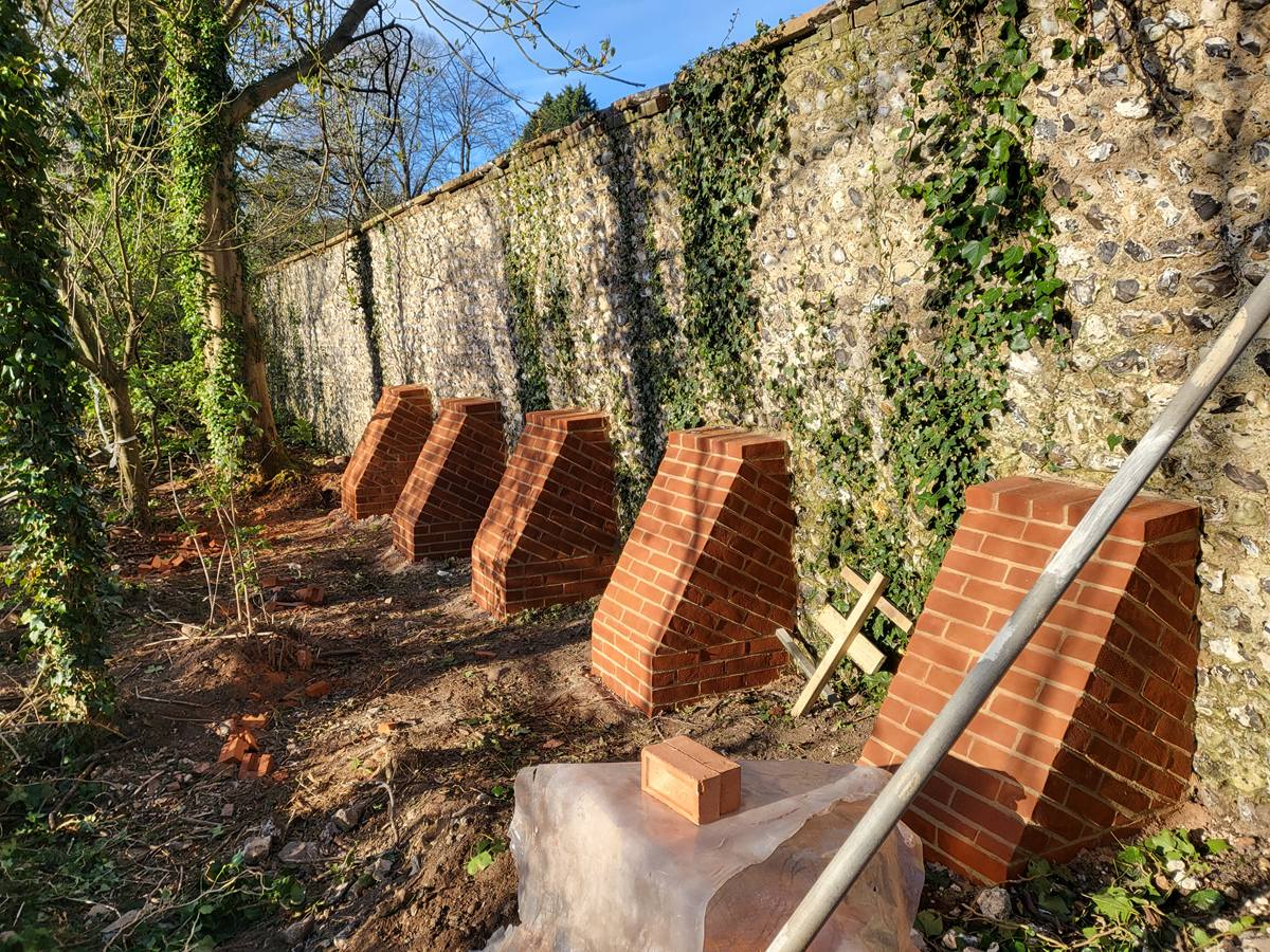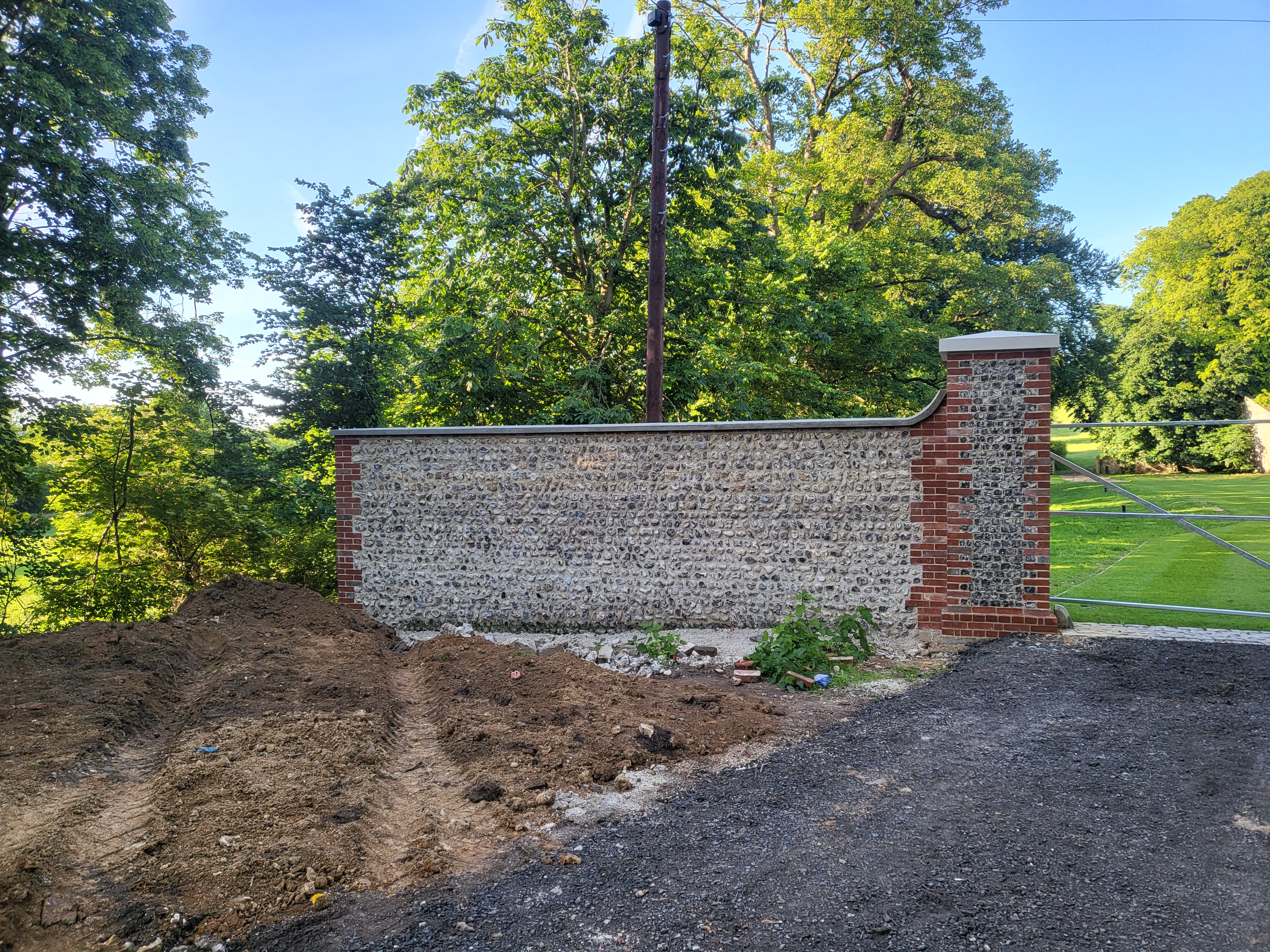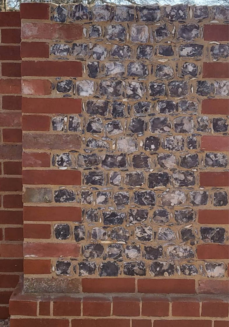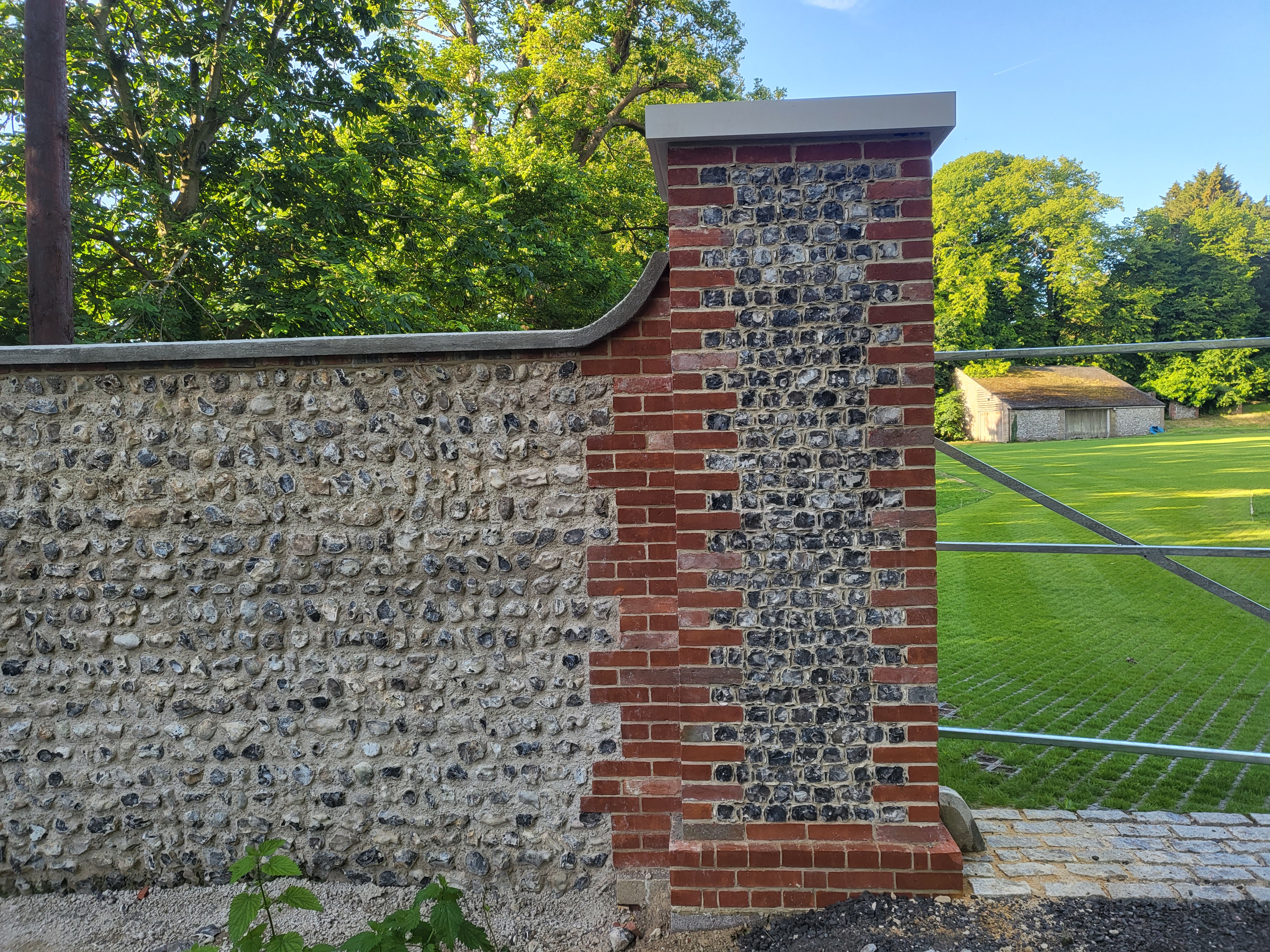 WT Lambs Hand made bricks were used for the pier and levelling course along with knapped flints and galletting for the pier. We re used the original flints along with some brought in off the Southdowns. A new portland stone capitol was placed on top of the brick pier and a continuous caping along the top of the wall. Brick buttresses were built on the exterior of the wall to give additional support.