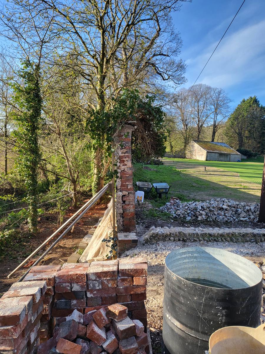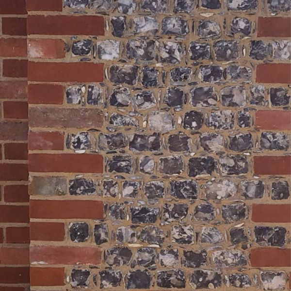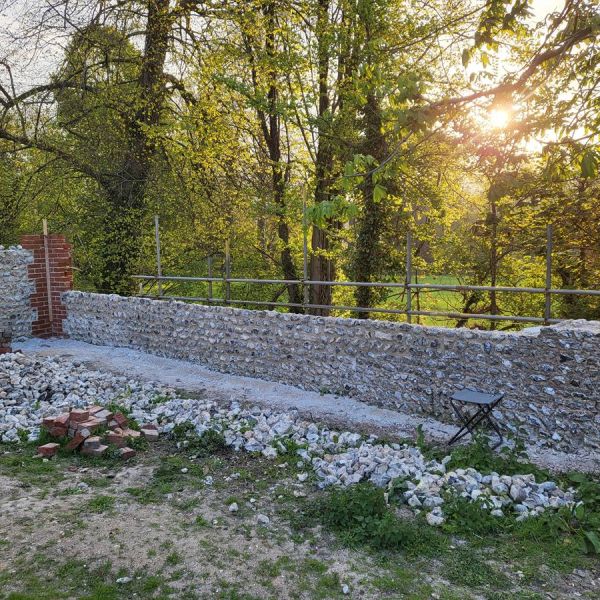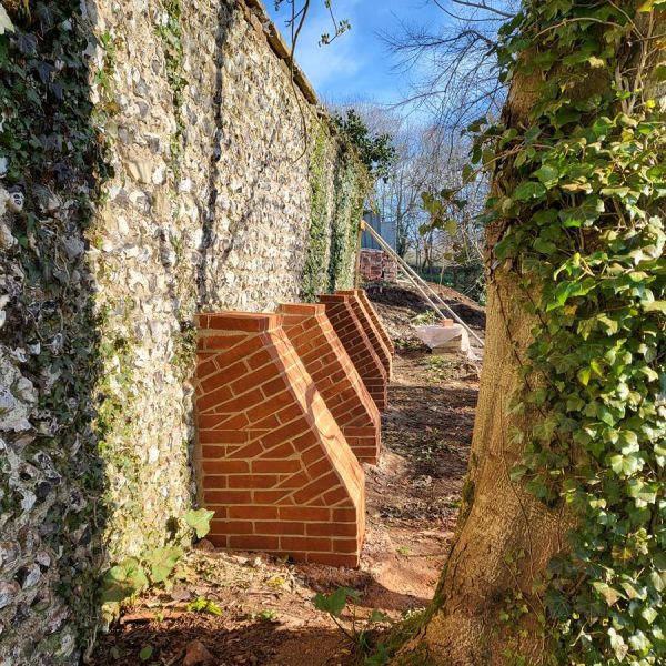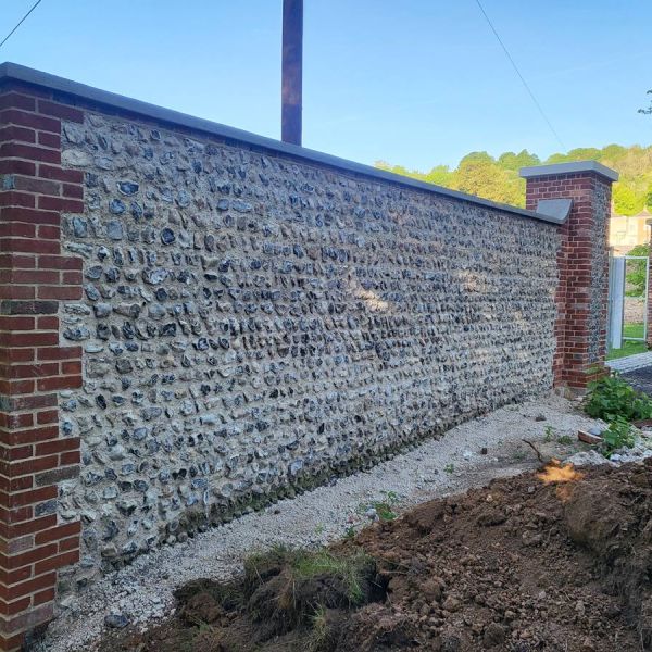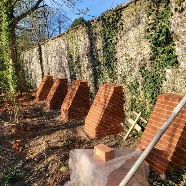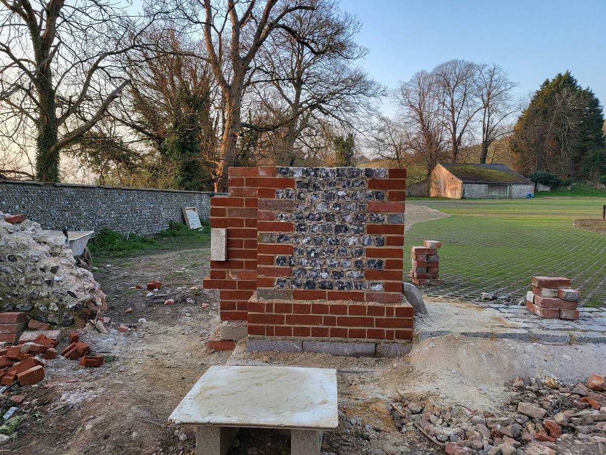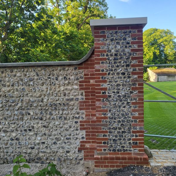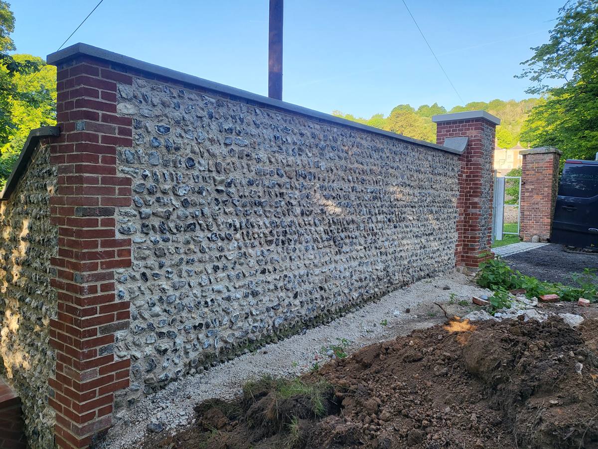 WT Lambs Hand made bricks were used for the pier and levelling course along with knapped flints and galletting for the pier. We re used the original flints along with some brought in off the Southdowns. A new portland stone capitol was placed on top of the brick pier and a continuous caping along the top of the wall. Brick buttresses were built on the exterior of the wall to give additional support.