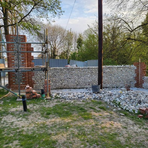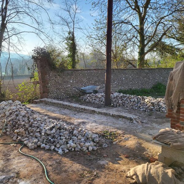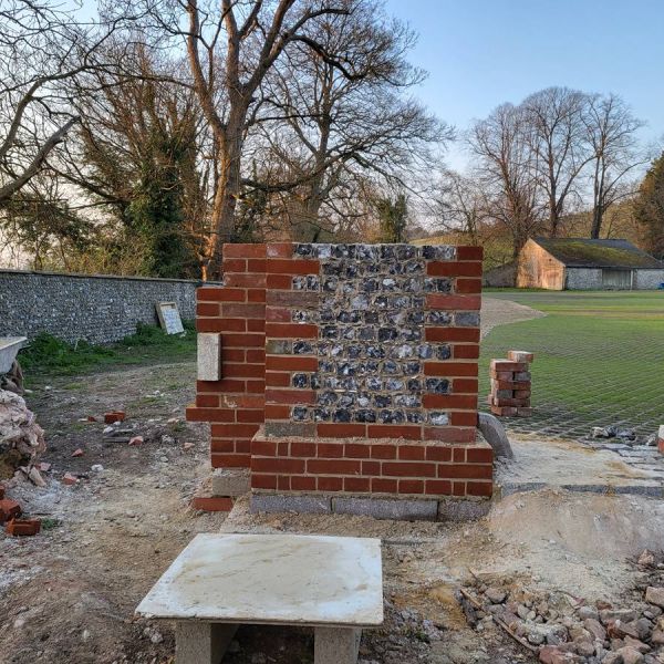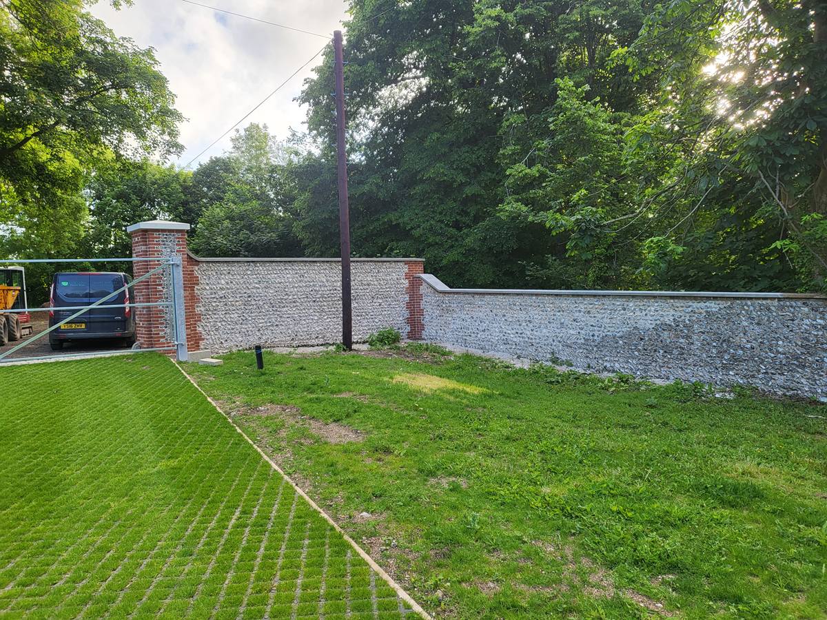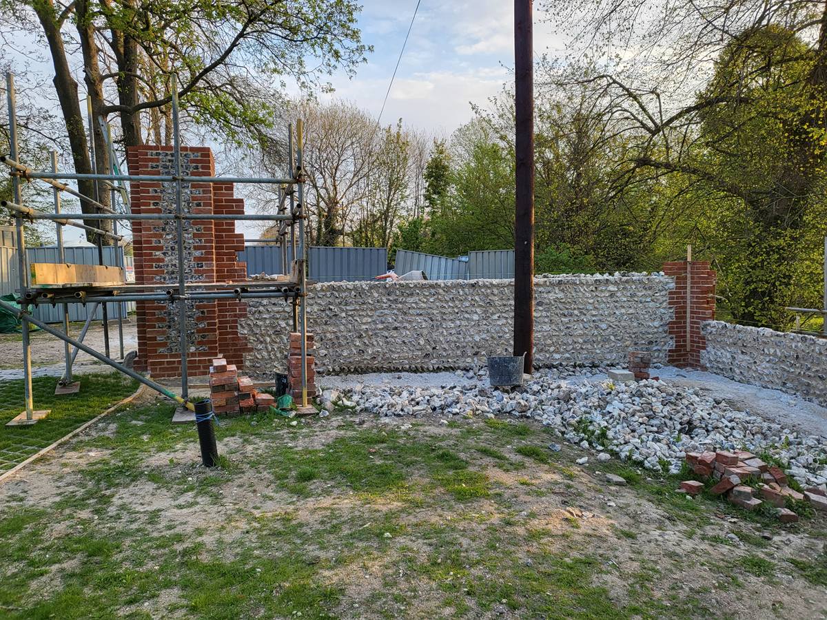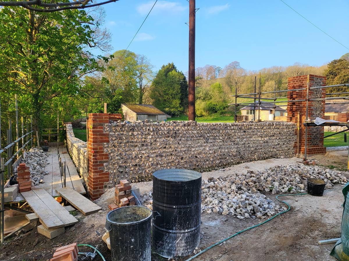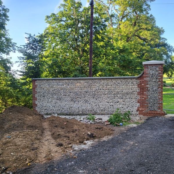 WT Lambs Hand made bricks were used for the pier and levelling course along with knapped flints and galletting for the pier. We re used the original flints along with some brought in off the Southdowns. A new portland stone capitol was placed on top of the brick pier and a continuous caping along the top of the wall. Brick buttresses were built on the exterior of the wall to give additional support.
