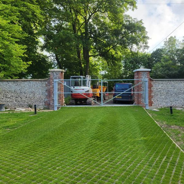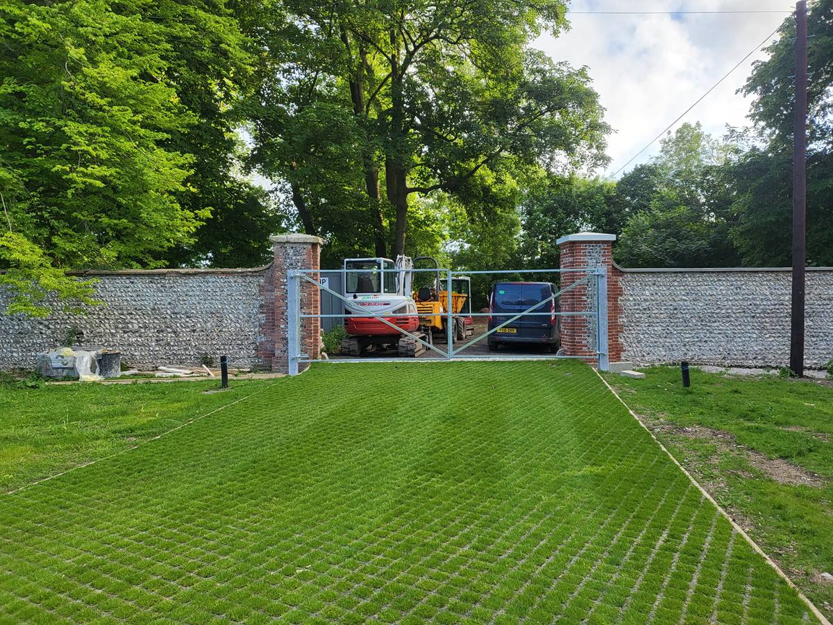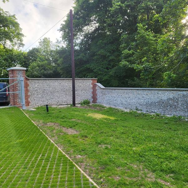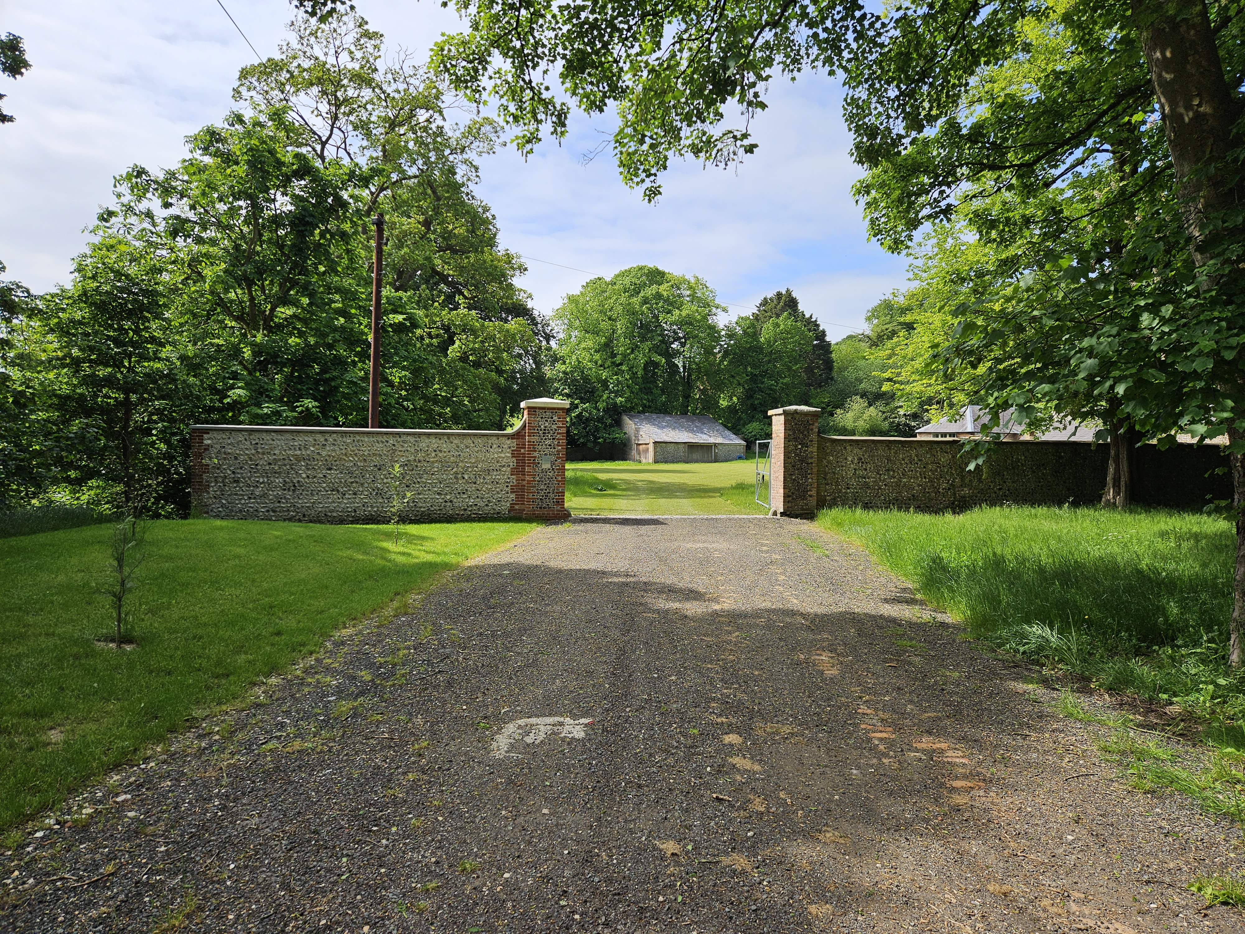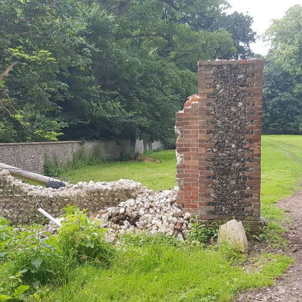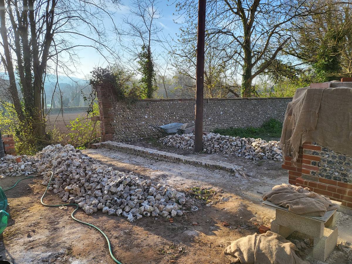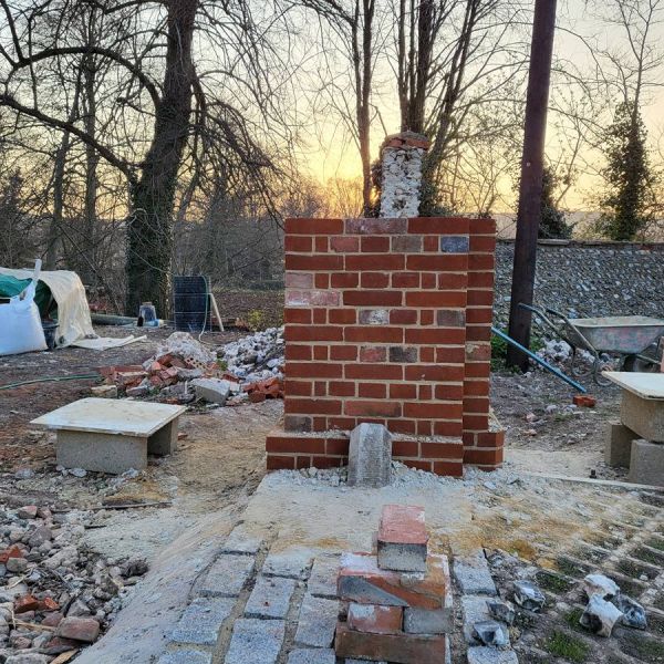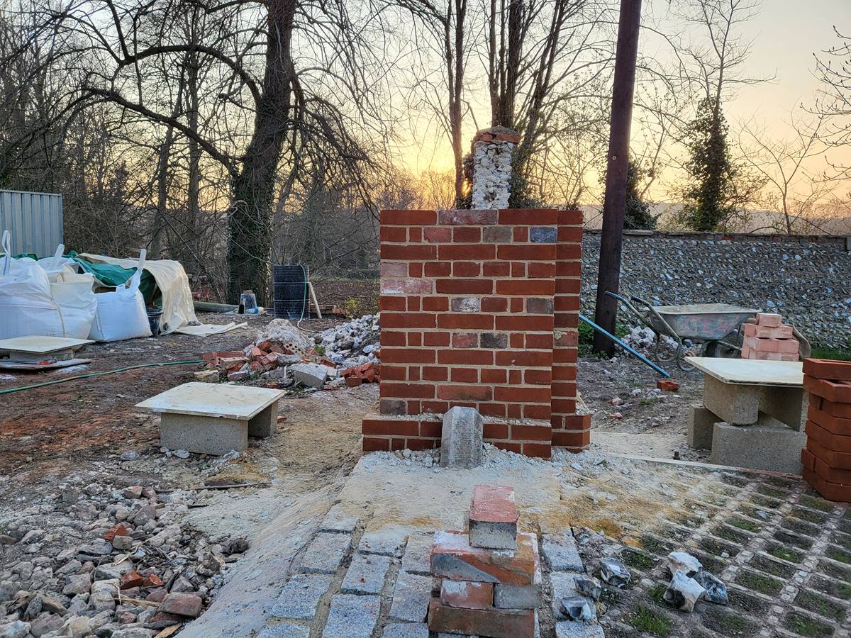 WT Lambs Hand made bricks were used for the pier and levelling course along with knapped flints and galletting for the pier. We re used the original flints along with some brought in off the Southdowns. A new portland stone capitol was placed on top of the brick pier and a continuous caping along the top of the wall. Brick buttresses were built on the exterior of the wall to give additional support.